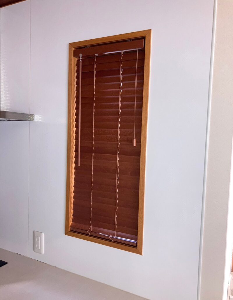 • リビングダイニングにあわせてキッチンのブラインドも温もりのあるウッドブラインドに吊替。 天井や建具に合わせた色味をお客様に選んでいただきました。