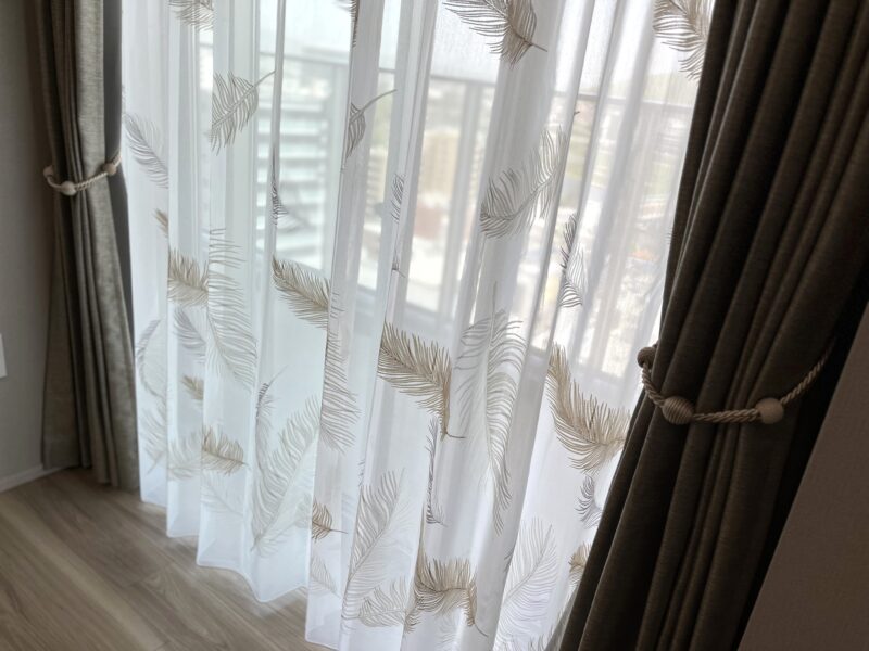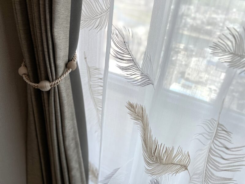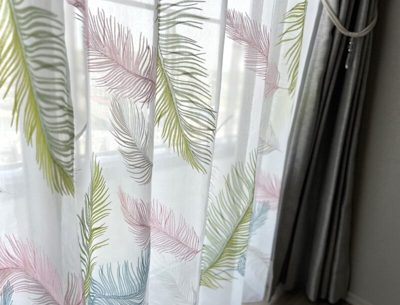 繊細な羽の表情が細かいステッチで丁寧に刺繍されたシアーカーテン。