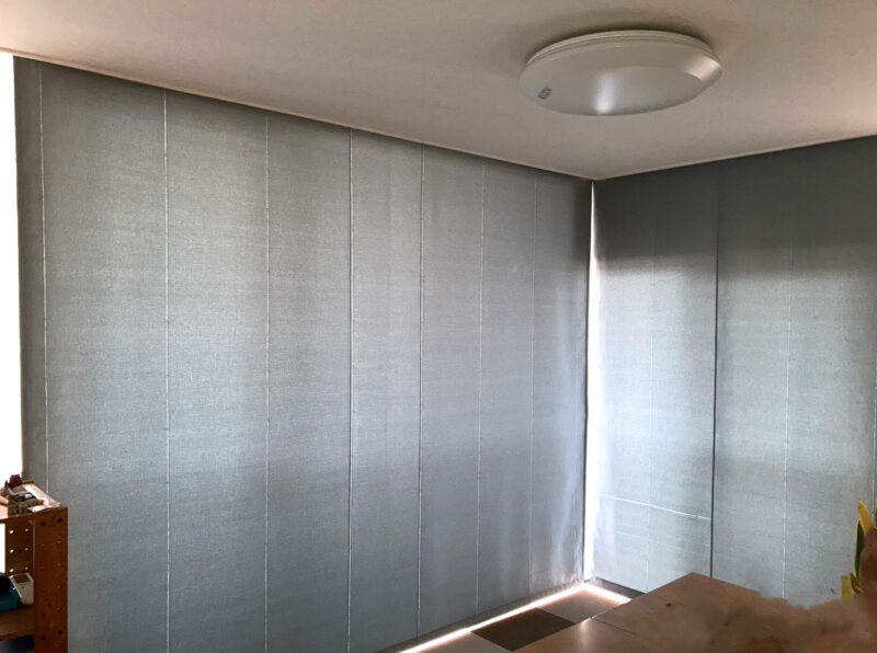 大きなコーナー窓でカーテンだとボリュームが出てしまうため、今回はシェードに吊替えることになりました。