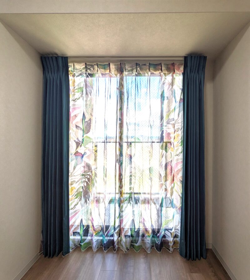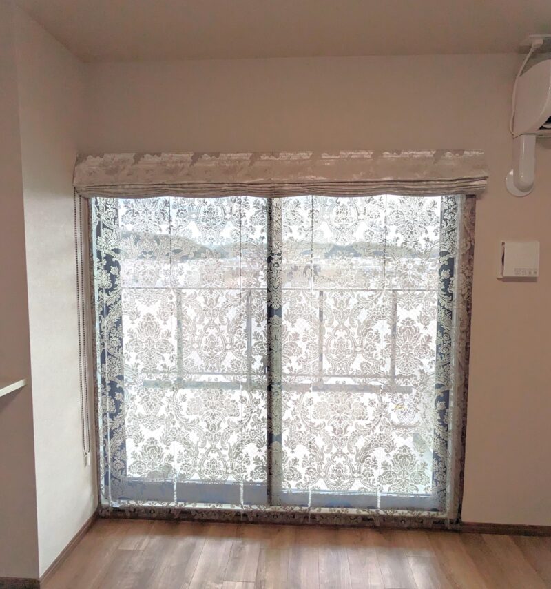 ドレープカーテンは、レースのプリントに使われているグリーン系のカラーをチョイスしコーディネート。