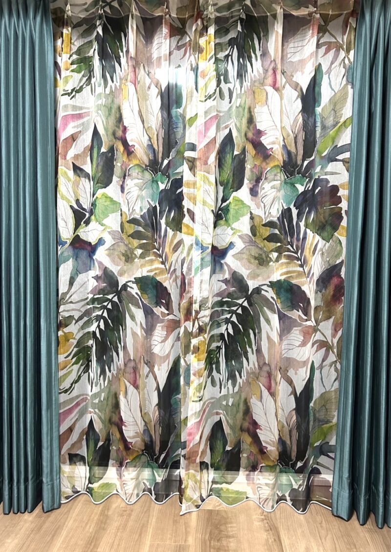 レースカーテンは熱帯の植物が描かれたプリント生地。