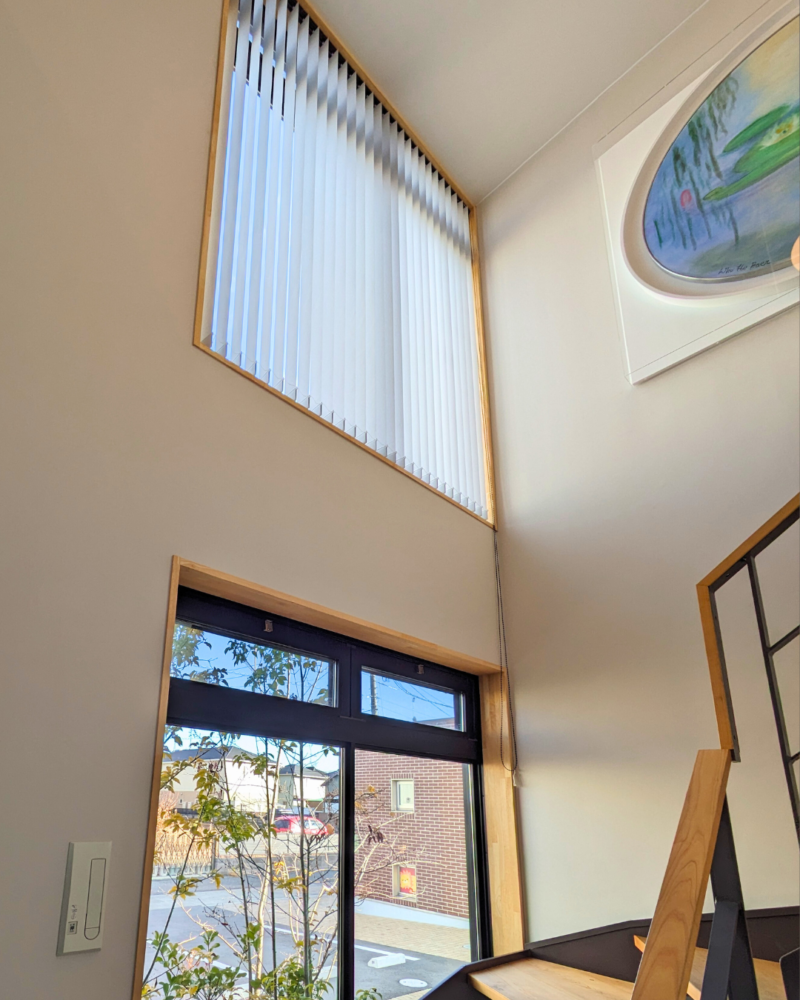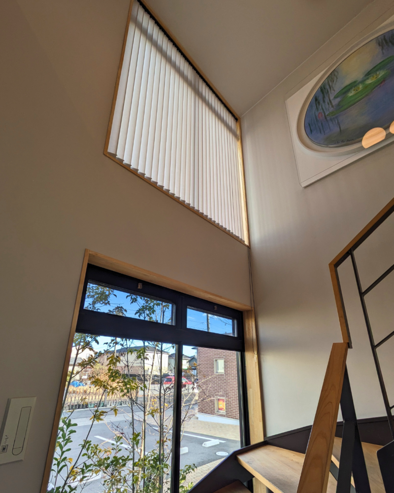 素敵な絵画のかかる吹き抜けの大空間には、是非バーチカルブラインドをと提案させていただきました。