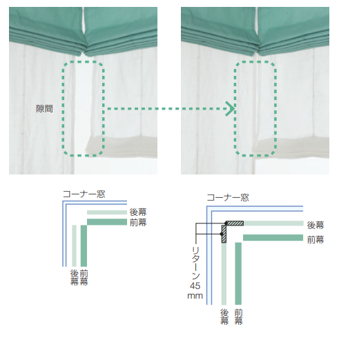 ツインシェード は通常、前幕と後幕をほぼ同寸で作成するのですが、コーナー窓の場合、後幕と後幕の間に隙間ができてしまいます。