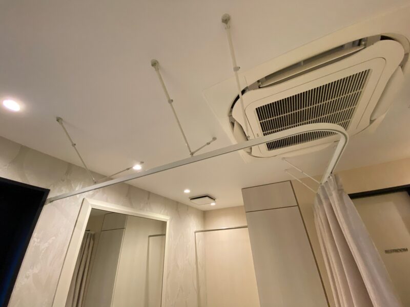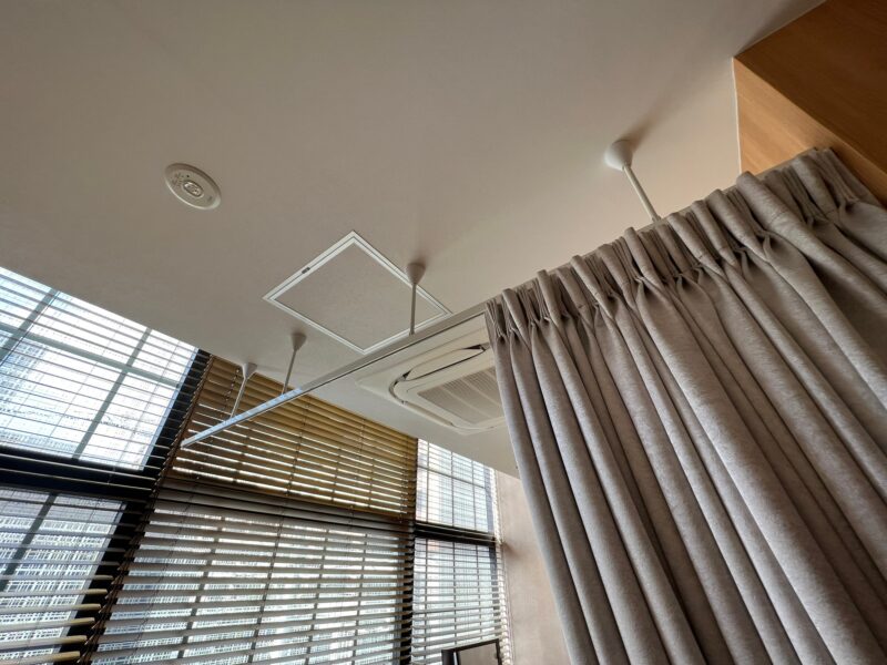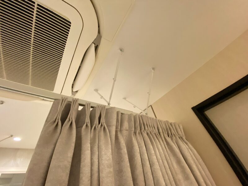 カーテンレールを取り付けたい位置には天井のエアコン等、干渉物がいくつかあり、それらを避けるため今回は中間吊り専用のカーテンレールを使用しました。