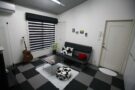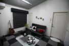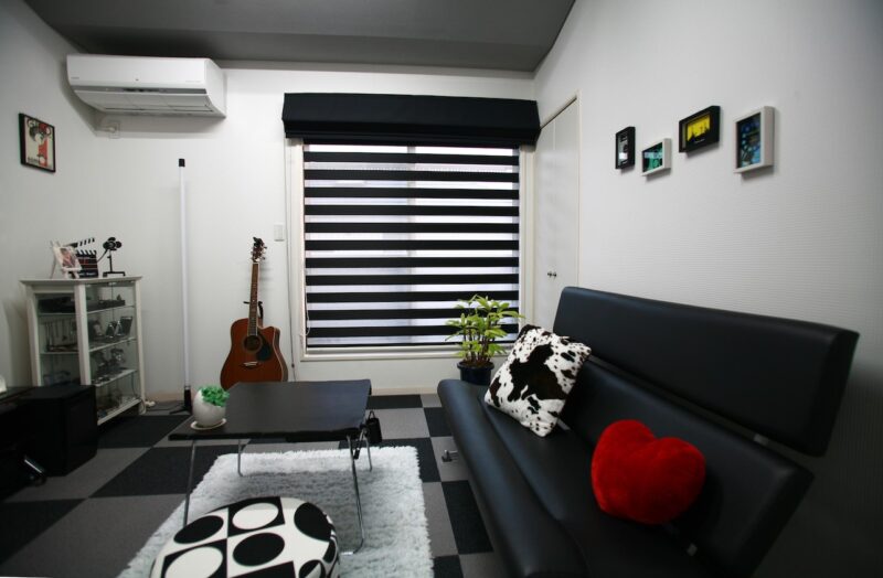 ⁡もともとホワイトのレース生地のシェードが吊られていましたが、今回ブラックを基調としたインテリアにあわせ、同系色の調光ロールスクリーンに吊替えました。
