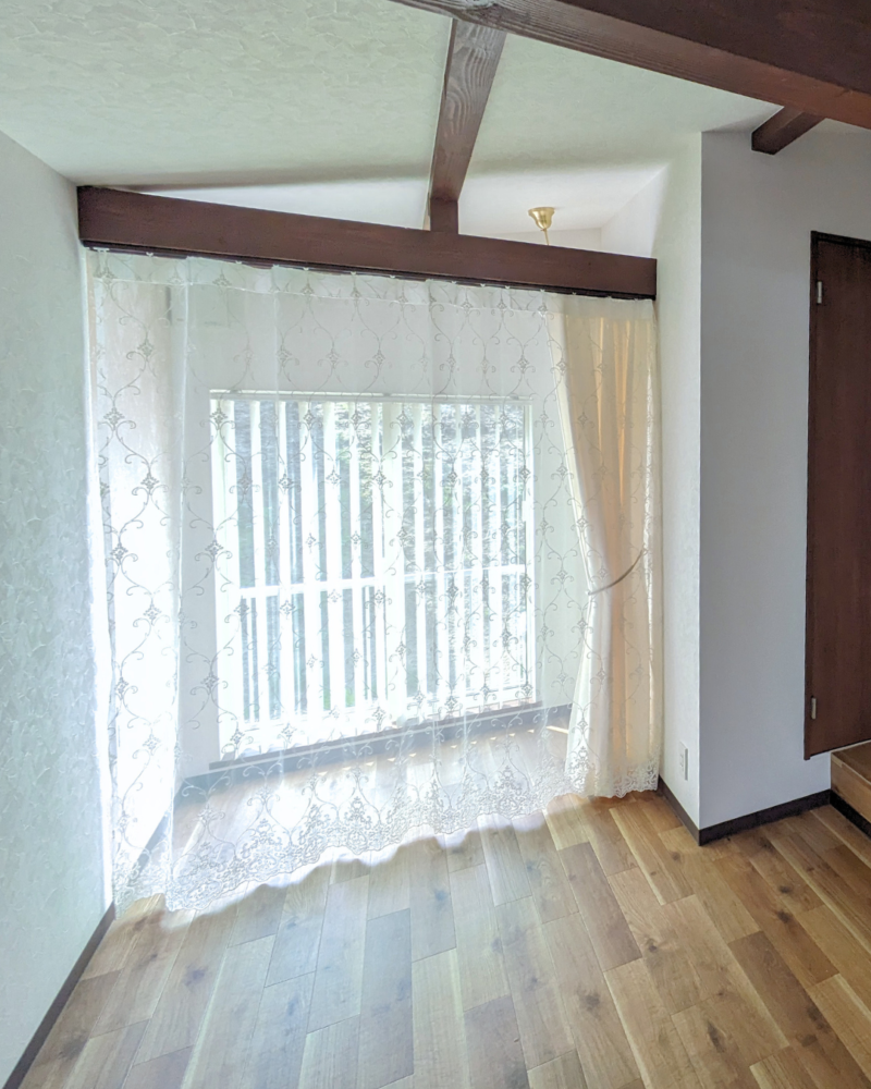 レースでは目隠しにならないけれど、なんとかお気に入りカーテンを使ってリラックスできる空間となるようご相談を受けました。