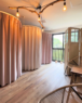 ナチュラルな木の温かみを惹きたてるやわらかな色合いのカーテン。