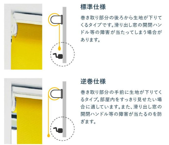 また、通常のロールスクリーンは生地が後ろ(窓側)から降りてきますが、今回は生地が手前側から降りてくる『逆巻仕様』で製作しています。