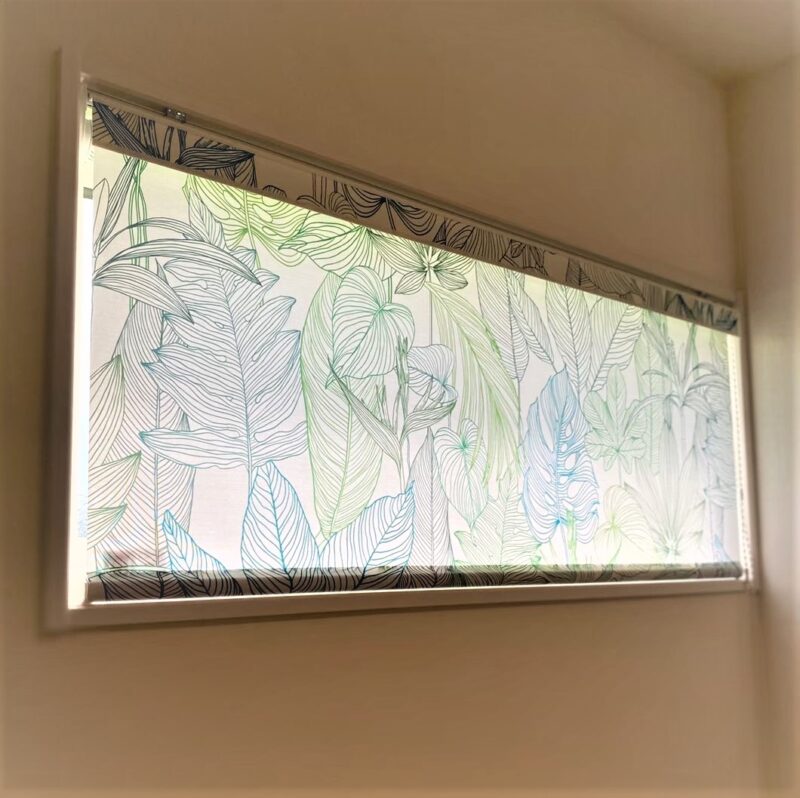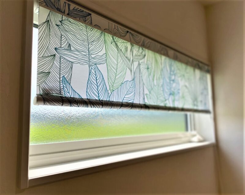 横幅のある小窓に取り付けられた、ボタニカル柄のロールスクリーン。