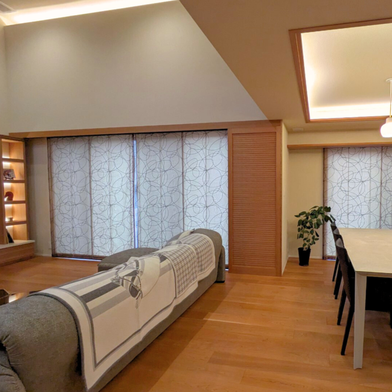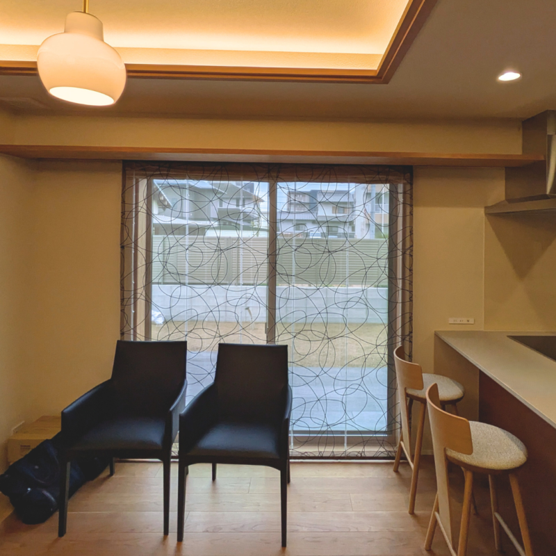オパールプリントで描かれた伸びやかなラインが、光を柔らかく取り込み、空間に心地よいリズムが生まれました。