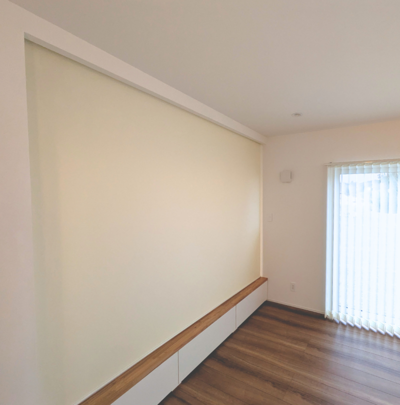 リビングとたたみコーナーの境にはロールスクリーンを据えています。