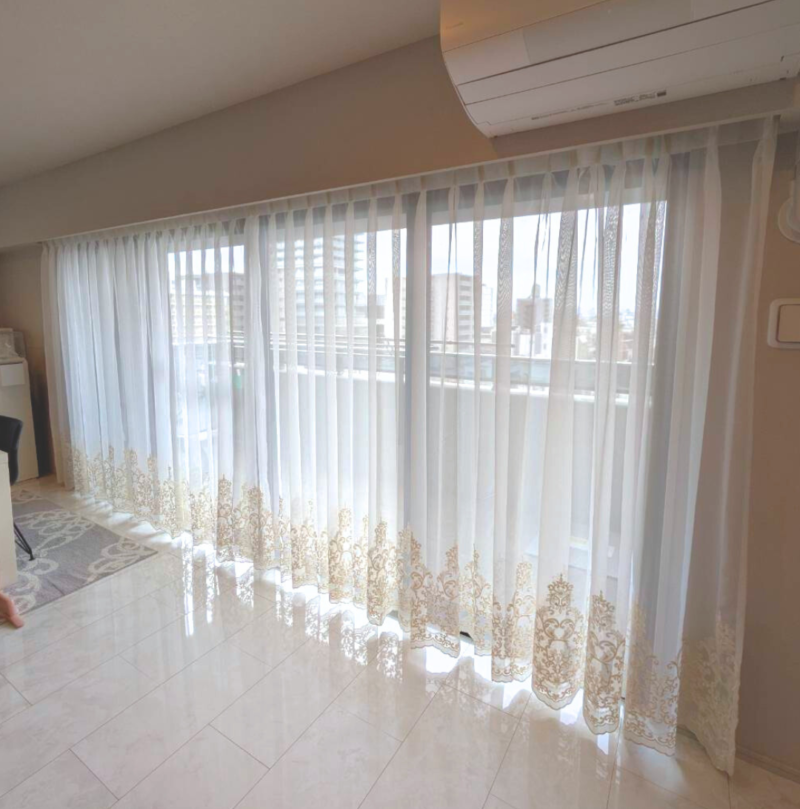 やわらかなレースに浮かぶエンブロイダリーの柄が、リビングをそっと彩ります。