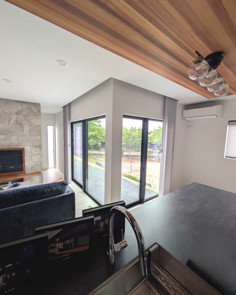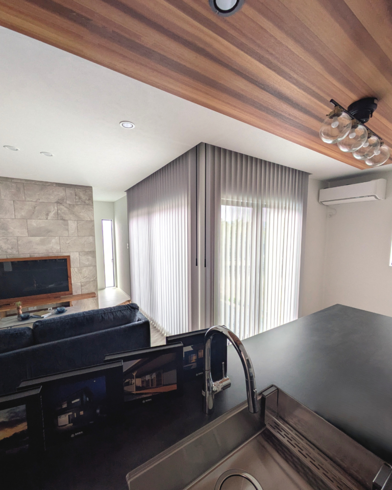 天井の木目、テレビ背面のタイル、ブラックのカウンター。