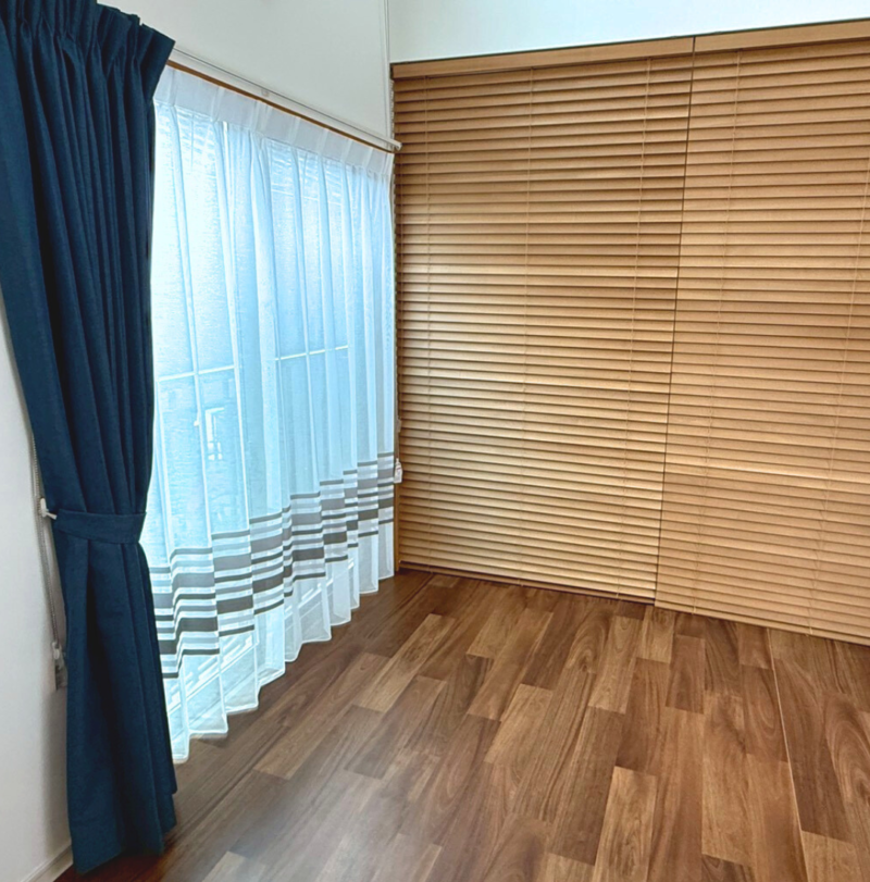 収納の間仕切りにウッドブラインドを据えるのに合わせて、隣り合った窓のカーテンのご相談を承りました。