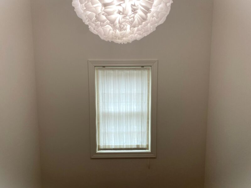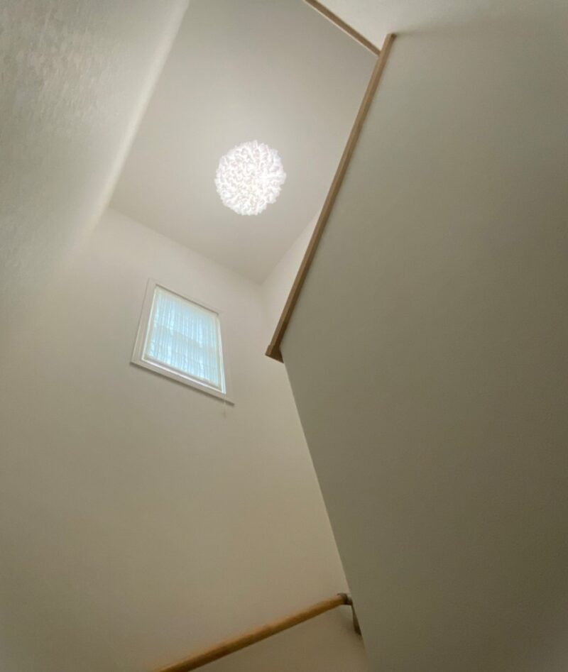 階段スペースの小窓にはプレーンシェードを施工。