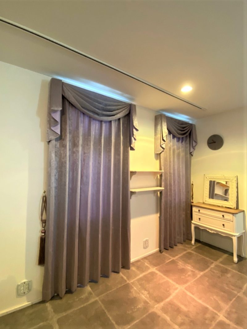①エステサロンのカーテン施工。女性が安らげる空間をに仕上げたい。