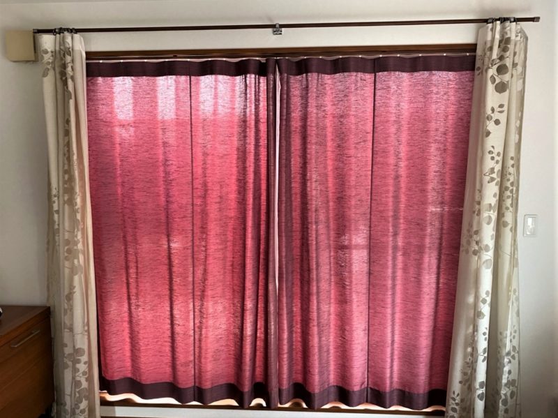 • <吊替前>深みのある赤いドレープにレースインスタイル。 印象的な窓装飾で、こちらもとても素敵でした。