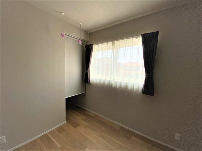 ①ウォークインクローゼットに間仕切りを取り付けたいが、窓とクローゼットの入口がかなり接近しているため、カーテンが間仕切に干渉してしまわないか心配。