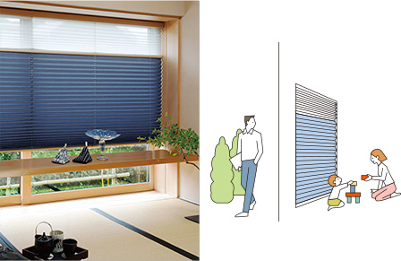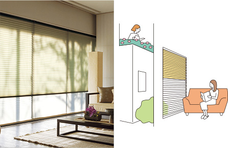 お庭の風景を楽しみたい方にオススメです。厚地生地はレース生地と同じくらいの透け感で、2枚のスクリーンが重なることで光の繊細な演出を楽しむことができます。また、上からの視線を遮ることもできます。
