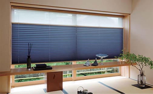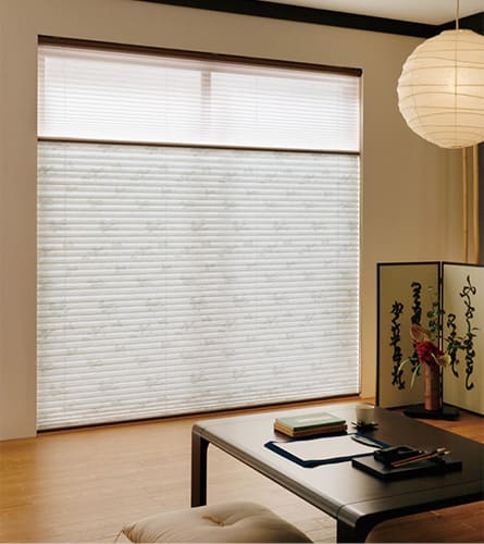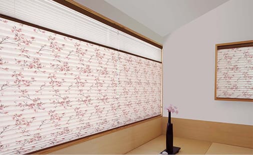プリーツスクリーンは和紙のような風合いが魅力的ですが、中には白花や小菊などの花柄をデザインしたテキスタイルもあります。また、カラー展開も豊富で、和室に様々な表情を与えることが可能です。柔らかい光が差し込むため、和室に取り付けて障子の代わりにする方が増えています。和洋折衷のどのようなシーンにも合わせることができます。