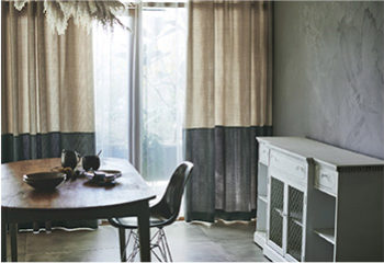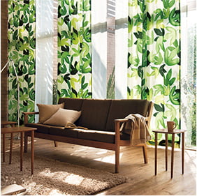 例えば緑色のカーテンといっても、下の写真のようにテイストが違うカーテンではイメージが全く異なります。